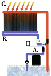 A) Using your existing pool pump, pool water is directed through a series of valves to your solar collectors. B) Pool water enters the solar collectors at the bottom and rises to the top through the individual tubes of the collector. C) As the water rises through the collector it is heated by the sun's radiant energy. The swimming pool water is then returned to your pool to repeat the cycle until your pool is warm. |